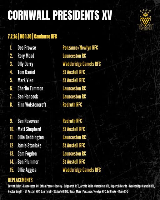 Congratulations to all the players selected to play this Saturday. Kick-off 1:30 pm at Camborne RFC. Entry £10 on the gate, under 16s free entry.